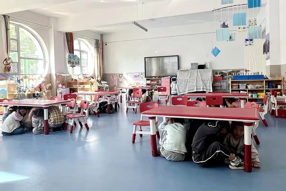 在大武口区幼教集团总园,老师通过课件和视频相结合的形式讲授自救知识,安全疏散铃响起,幼儿们在室内避险自救等待警报解除。