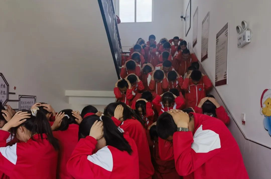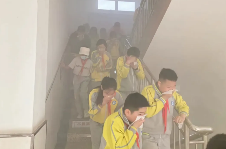 演练现场浓烟扑鼻,宁夏长庆小学学生迅速双手护头、弯腰低身,三分钟内有序地从教室撤离至操场安全地带。