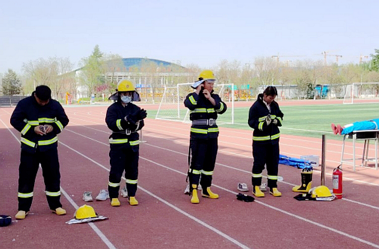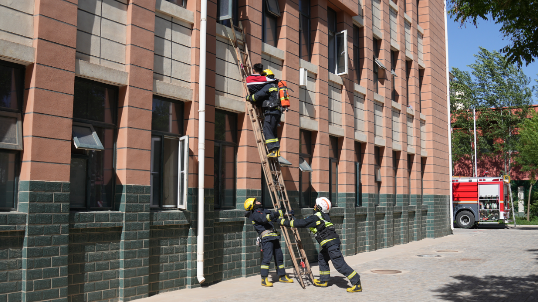 宁夏建设职业技术学院学生穿戴专业防护服,依序完成清理障碍、火场救困等环节,将“火场被困人员”成功救出。
