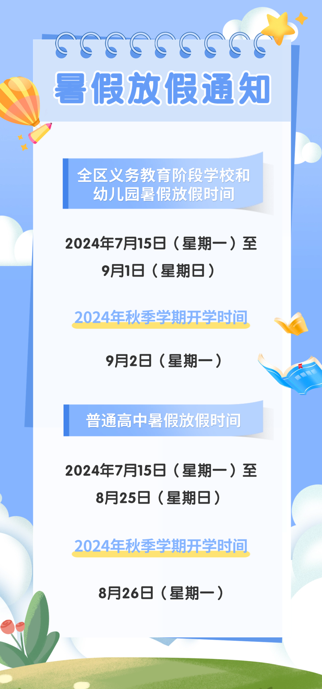 近日,自治区教育厅办公室印发《关于公布2024年中小学幼儿园暑假时间的通知》,安排暑假放假有关事宜。