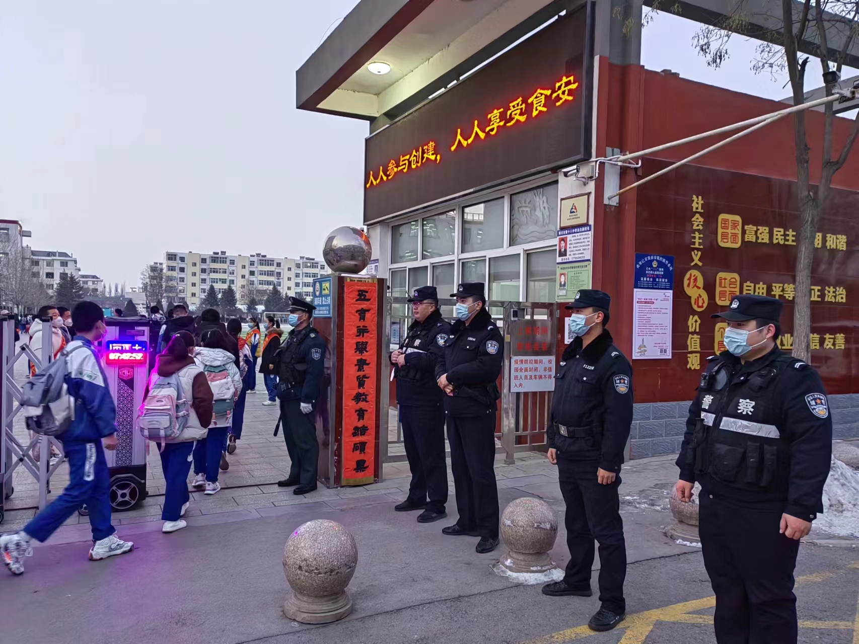 2023年2月14日早晨7:30,文昌路派出所四名民警、家长护学岗、学校行政在学校大门口护学,学生排着整齐的队列,戴口罩、保持一定的安全距离,经过测温通道,有序进入学校,开始了一天紧张忙碌的学习生活;
