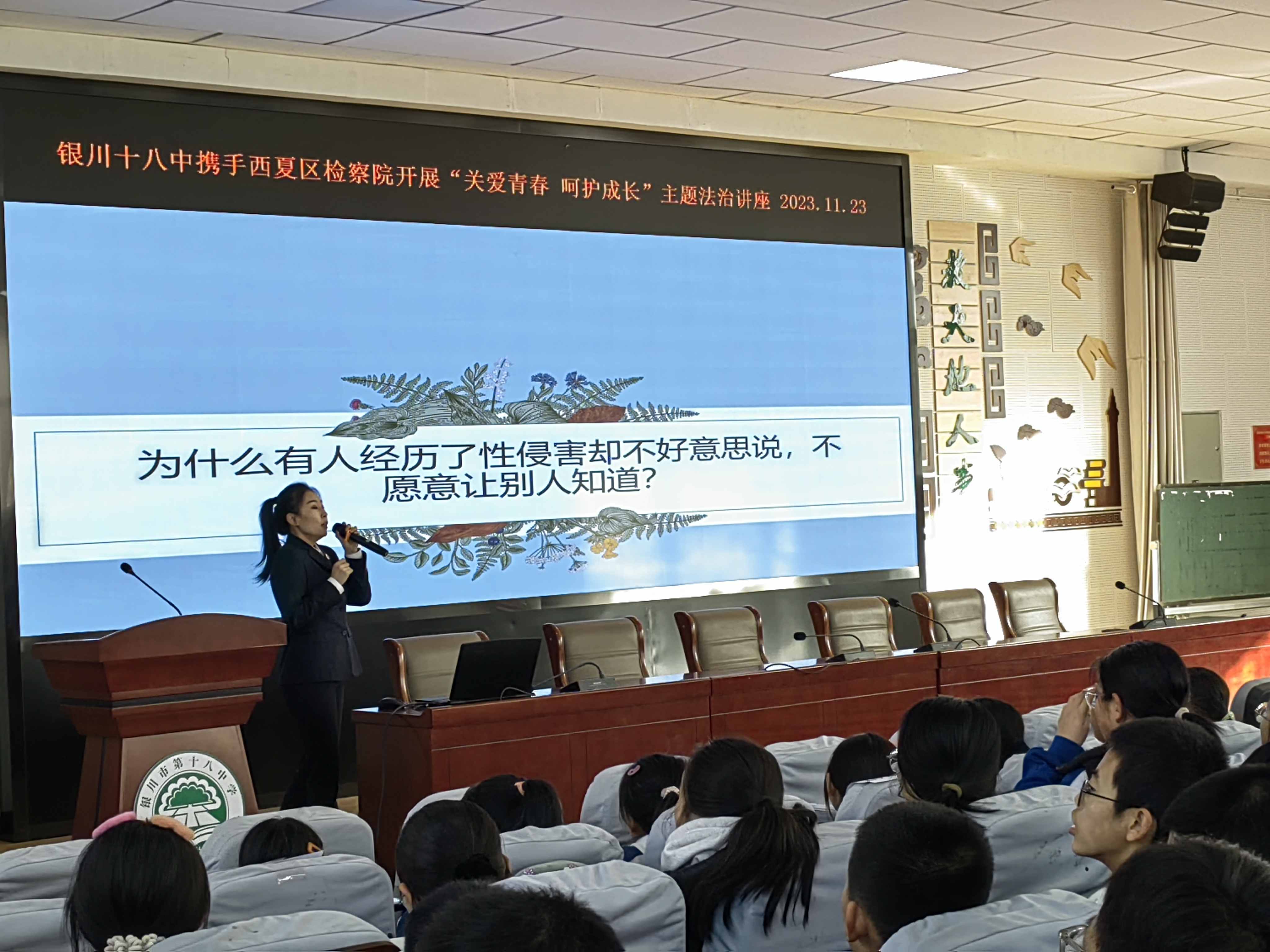 在第十个国家宪法日来临之际,为营造浓厚的工作氛围和强大的舆论声势,进一步增强全体师生的安全法治意识,加强未成年人的自我防范和自我保护能力,打造平安和谐美好校园,11月23日,银川十八中携手西夏区检察院,开展“关爱青春 呵护成长”为主题的法治讲座。学校德育副校长袁峰同志和八年级班主任及学生共计300多人参加了本次活动。