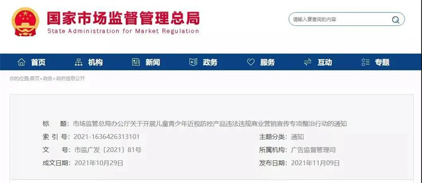 日前,市场监管总局发布《关于开展儿童青少年近视防控产品违法违规商业营销宣传专项整治行动的通知》。