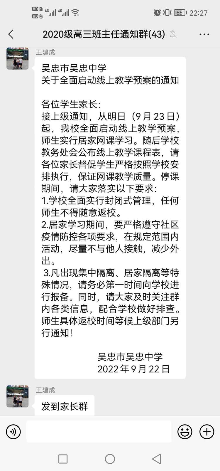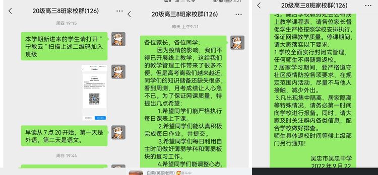 高三年级组在学校的科学领导下,统筹协调、高效组织,多措并举,力排万难,认真落实,第一时间在家长群中发布《线上教学预案》通告,家校无缝对接,确保学生安全,让家长及时知晓上级和学校的安排要求及学生的动态。