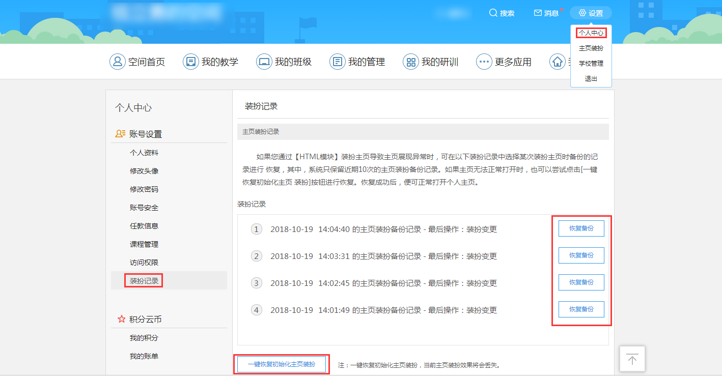如果您通过“HTML”装扮展示空间主页导致展现异常时,可以在“个人中心”页面的“装扮记录 ”中选择某次装扮主页时备份的记录进行恢复,也可以尝试点击“意见恢复初始主页”按钮进行恢复。恢复成功后,便可正常打开个人主页。