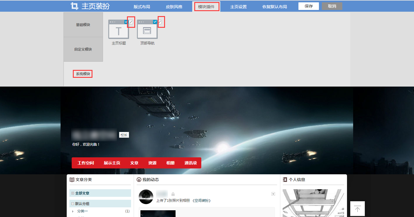 您可以进入个人空间“设置“- “主页装扮”,进人“系统模块”选择模块插件,系统模块中分为页面标题和顶部导航,选择白色小铅笔图标可进行修改。